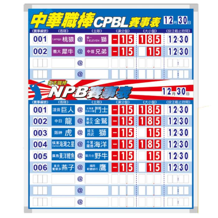 中日職賽事白板,包含以下商品: